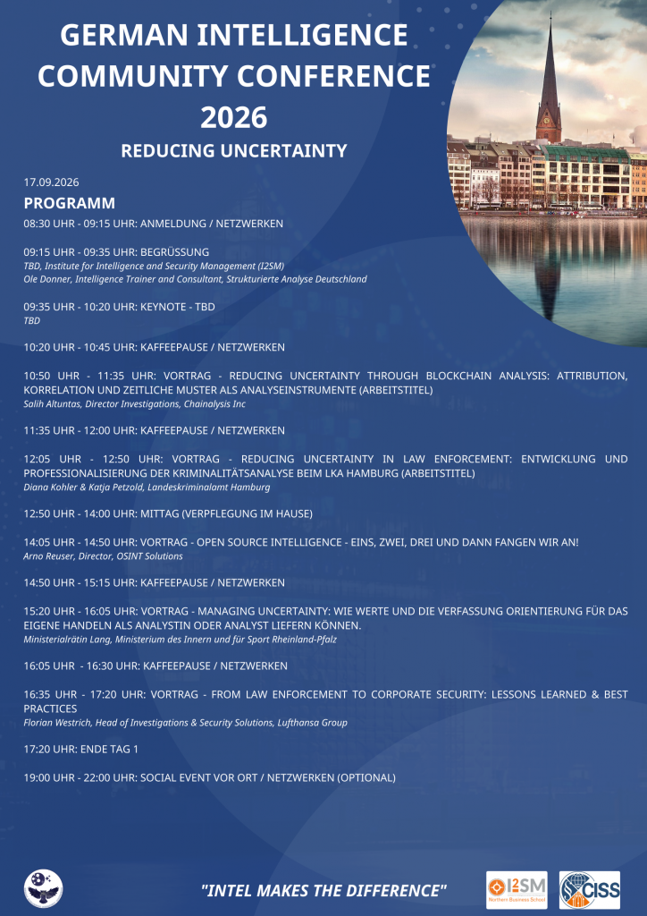 Die German Intelligence Community Conference 2026 wird in Kooperation mit dem Institute for Intelligence and Security Management (I2SM) der Northern Business School durchgeführt.