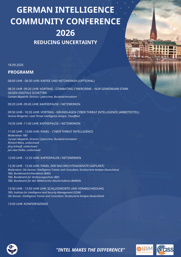 Intelligence als Disziplin gewinnt in Deutschland zunehmend an Bedeutung. Mit diesem Wachstum steigt auch die Nachfrage nach grundlegendem Wissen, aktuellen Entwicklungen und praktischen Beispielen. Genau hier setzen wir an. Unsere jährliche Konferenz bietet zielgerichtete Vorträge, Panels und Diskussionen, um dieser Nachfrage gerecht zu werden und gemeinsam eine noch professionellere deutsche Intelligence Community zu schaffen.